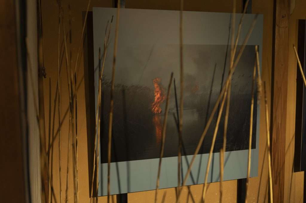 炎にゆだねられるヨシ